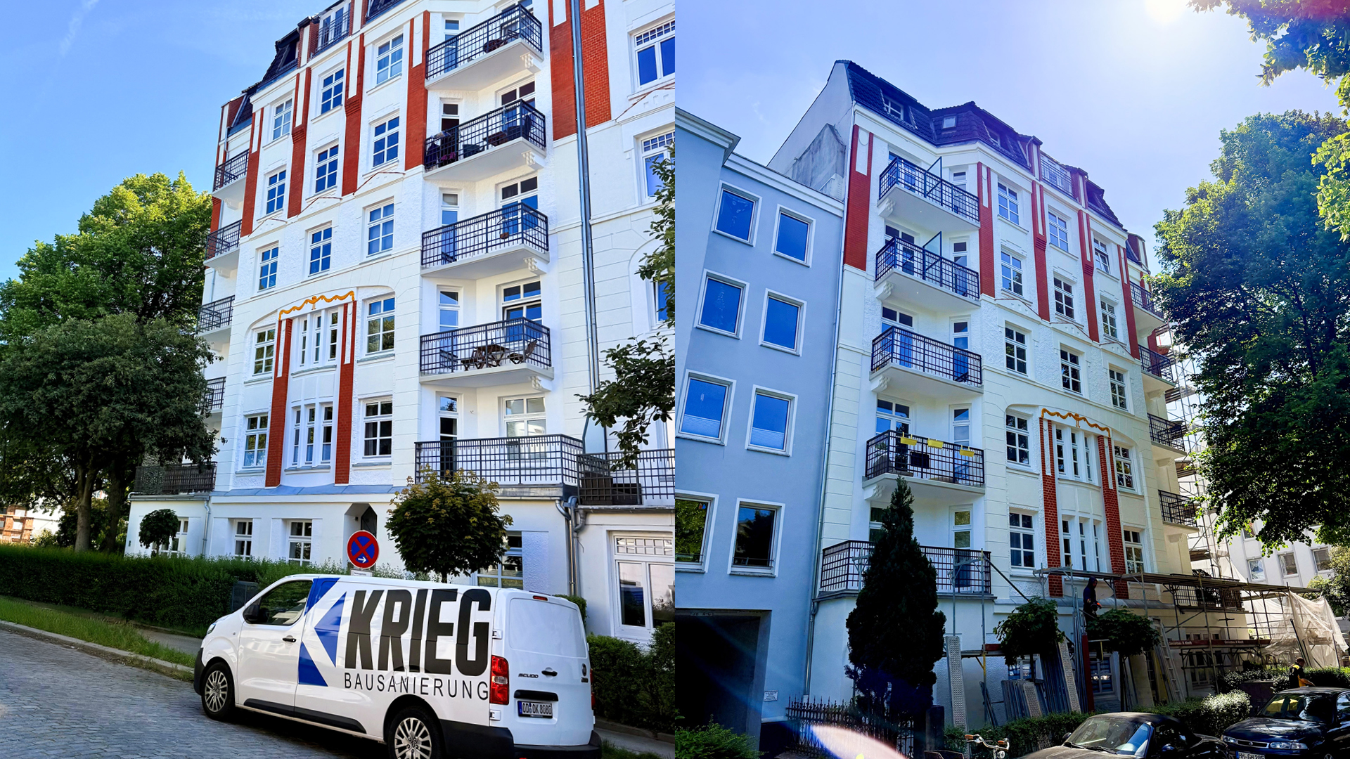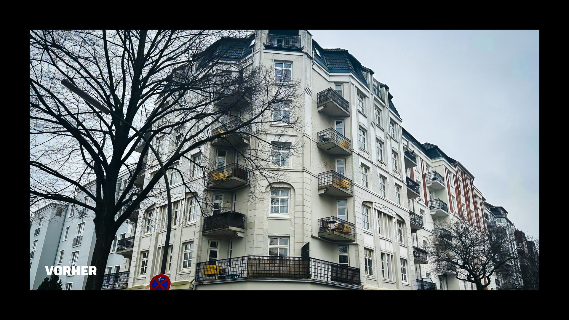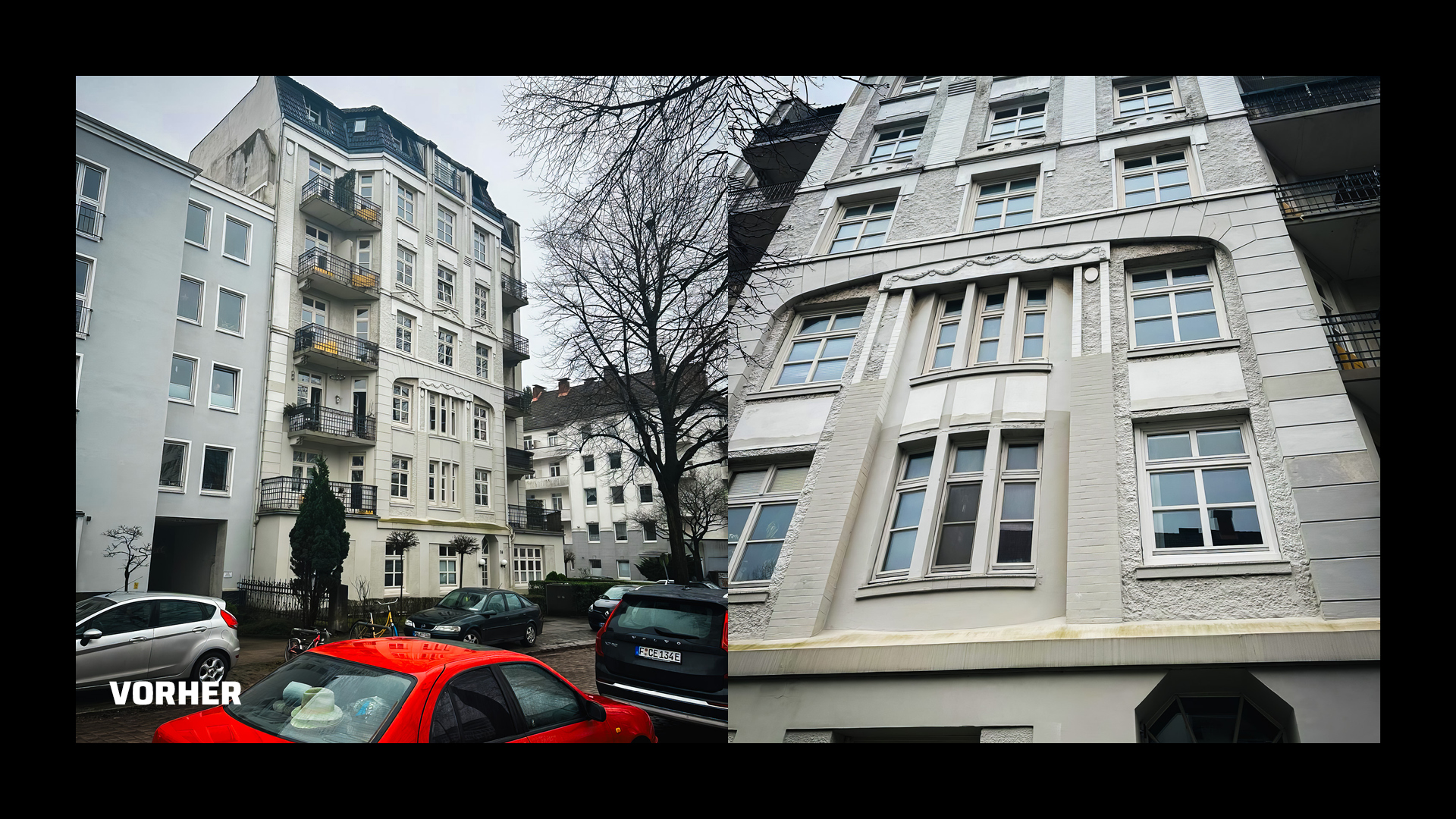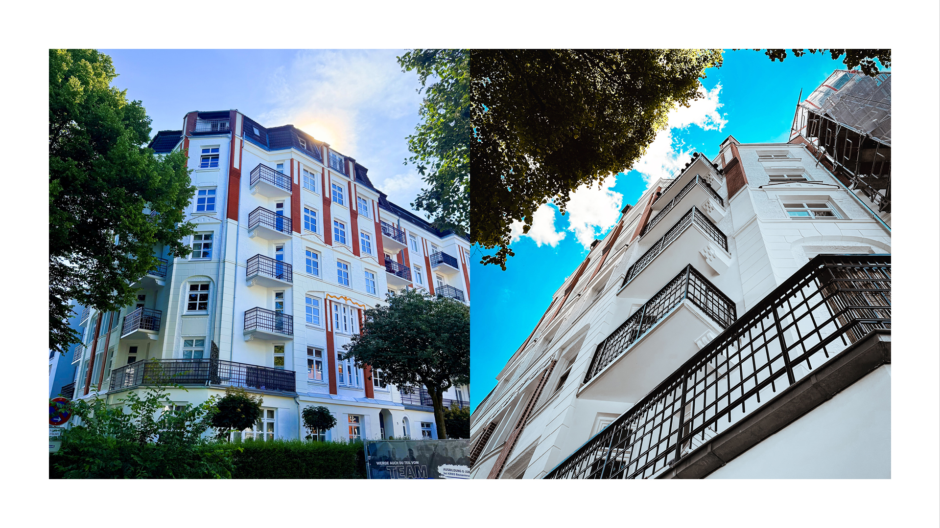 Die alte Farbe wurde komplett abgebeizt, 16 Balkone umfassend saniert und mit neuer Beschichtung versehen. Die Stuckelemente haben wir sorgfältig nachgearbeitet, und auch die Fenster erstrahlen dank frischer Lackierung in neuem Glanz.